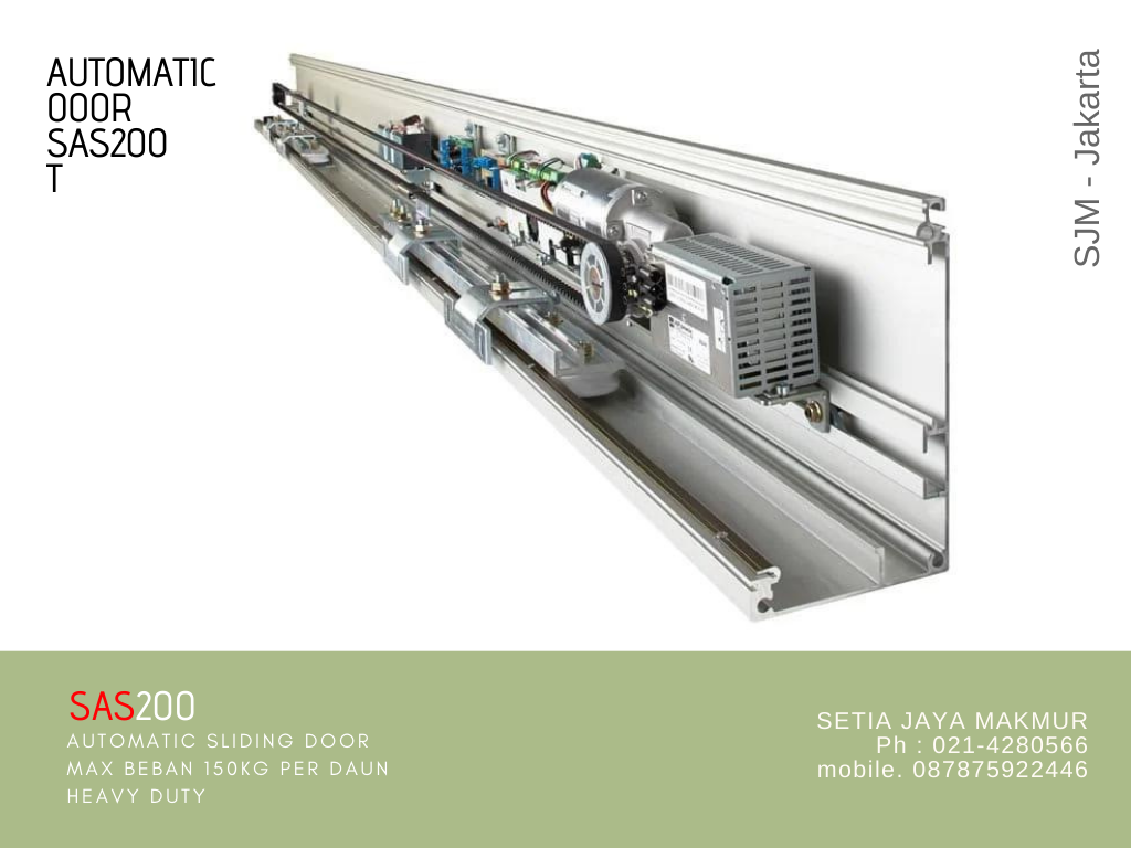 SAS ES200EasySAS ES200Easy & SAS ES200STD Automatic sliding door dengan kemampuan beban pintu untuk 2 x 90Kg, atau 1 x 110Kg. yangg dilengkapi dengan system microprocesor. motor tahan panas, dengan kecepatan yg dapat diatur sesuai kebutuhan, dilengkapi dengan 2 system pengoperasian yg dapat di pilih, Remote control atau Program switch 5 posisi (off, Auto,One way, Half Open, Permanen Open ). sensor infra red yg dapat diatur ke berbagai sudut dengan ketinggian maximum 7 meter. dan Cocok untuk dipergunakan pada Office, Rumah tinggal, Apartmen, Supermarket, Pabrik,dll